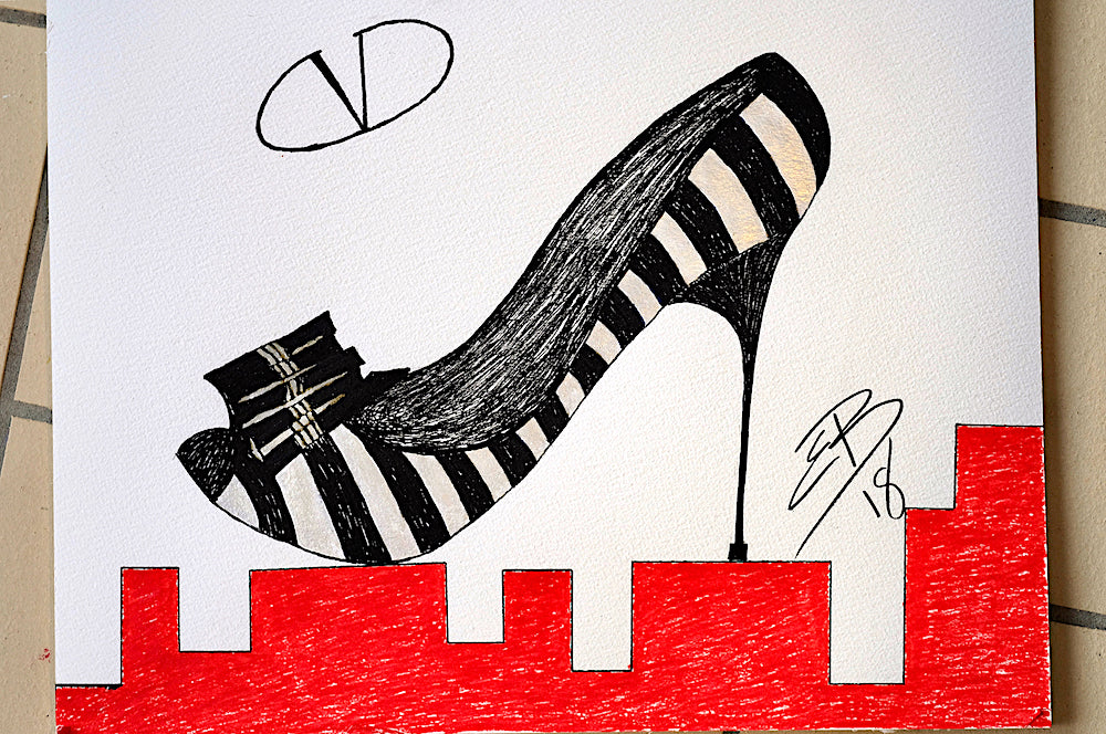 I love to draw fashion items that in different ways mean something to me, like these pairs of vintage Valentino shoes. I am a happy owner of some beautiful items from Valentino Garavani´s later collections, among other things these beautiful satin pumps that I have freely drawn and made my own interpretation of. I have worked in ink, pencil and aquarelles with a special pearl-shimmering effect. Everything to depict the luster and the feeling in the fantastic satin fabric. The artwork is framed in black oak frame with a beautiful Passepartout.